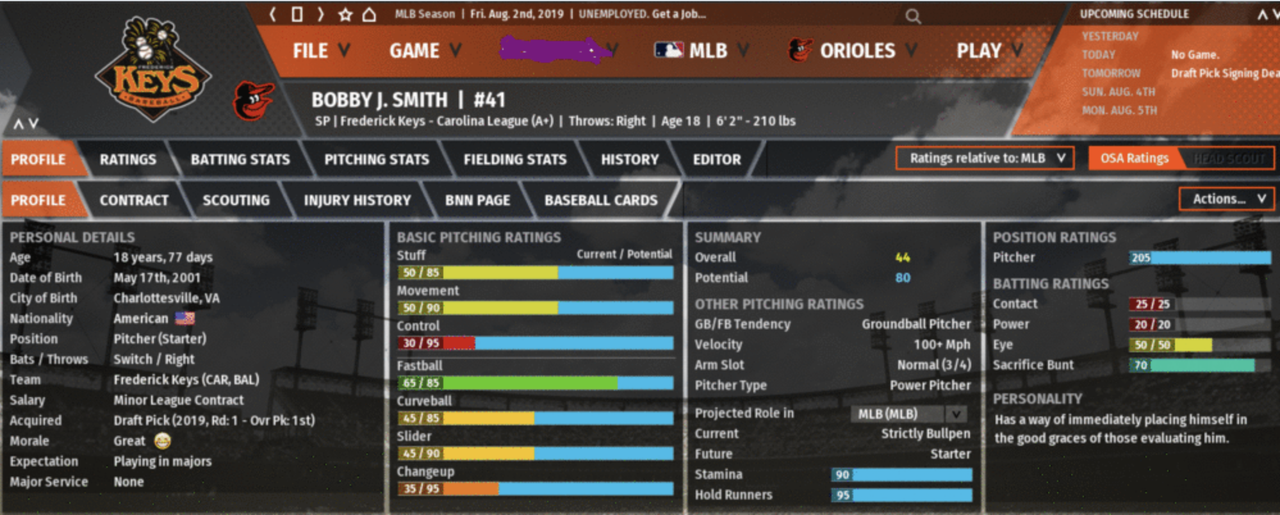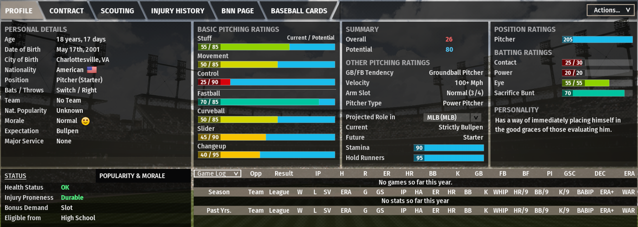 Anyway, here is a first look at Bobby J. Smith (since he's going through the draft I had to create him first) wells fargo number near meI created him by creating a fictional starting pitcher "Legend" template and modifying it. I didn't mess with his current overall ratings or his batting potential, but I maxed out almost everything else. We'll see where he gets drafted. |