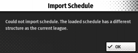 I don't know why, but I'm getting an error trying to import the schedule, saying the schedule has a different setup as the current league. I don't know why I'm getting the error, I have 1 subleague with 1 division of 28 teams...