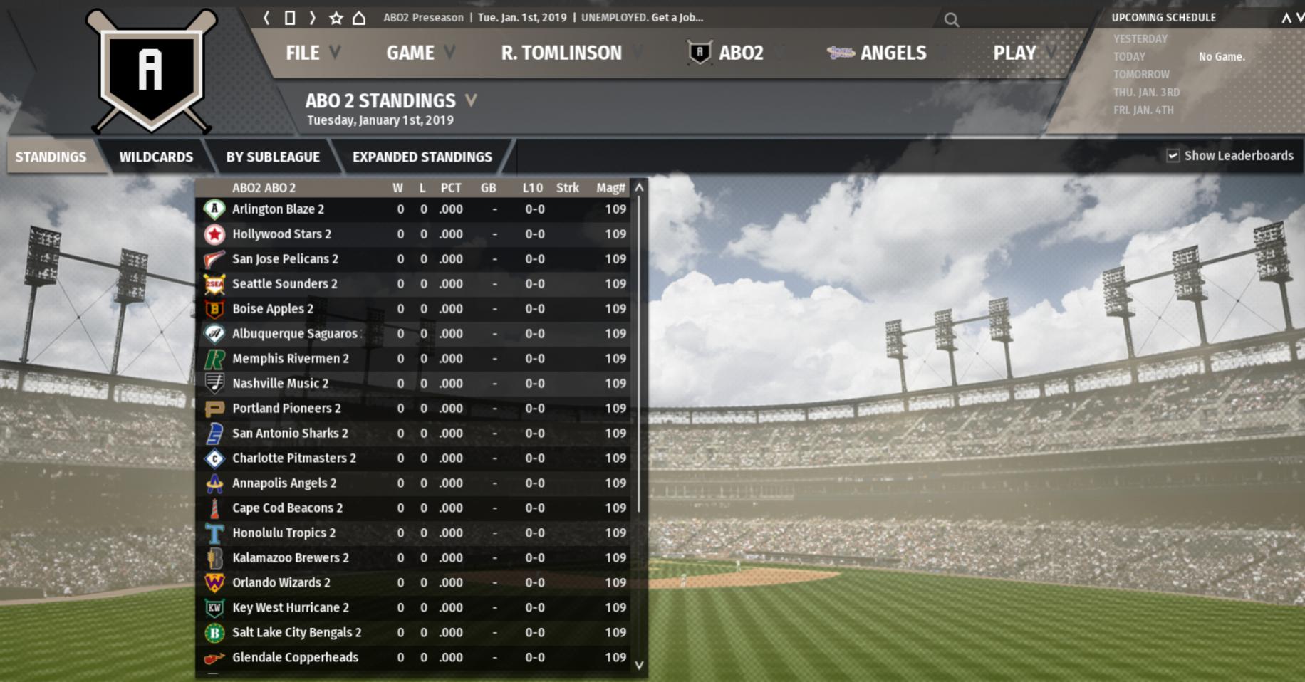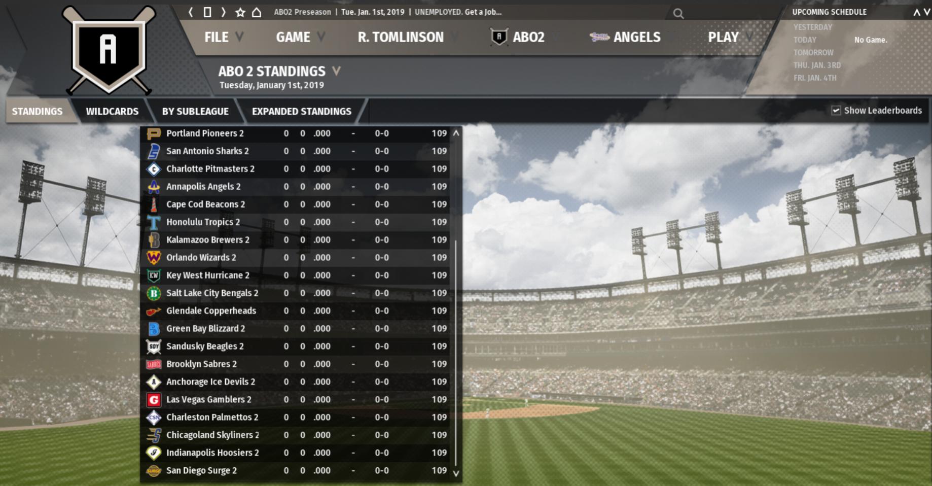 <SCHEDULE type="ILN_BGY_G108_SL1_D1_T28_C_" inter_league="0" balanced_games="1" games_per_team="108" start_month="5" start_day="1"> By eliminating that information in gmo's schedule, you can now use it for your league. So either delete that text or else copy-and-paste the following over the existing header: <SCHEDULE type="ILN_BGY_G108_T28_C_" inter_league="0" balanced_games="1" games_per_team="108" start_month="5" start_day="1"> Frankly, I'm not sure why that should make a difference, but it does. |