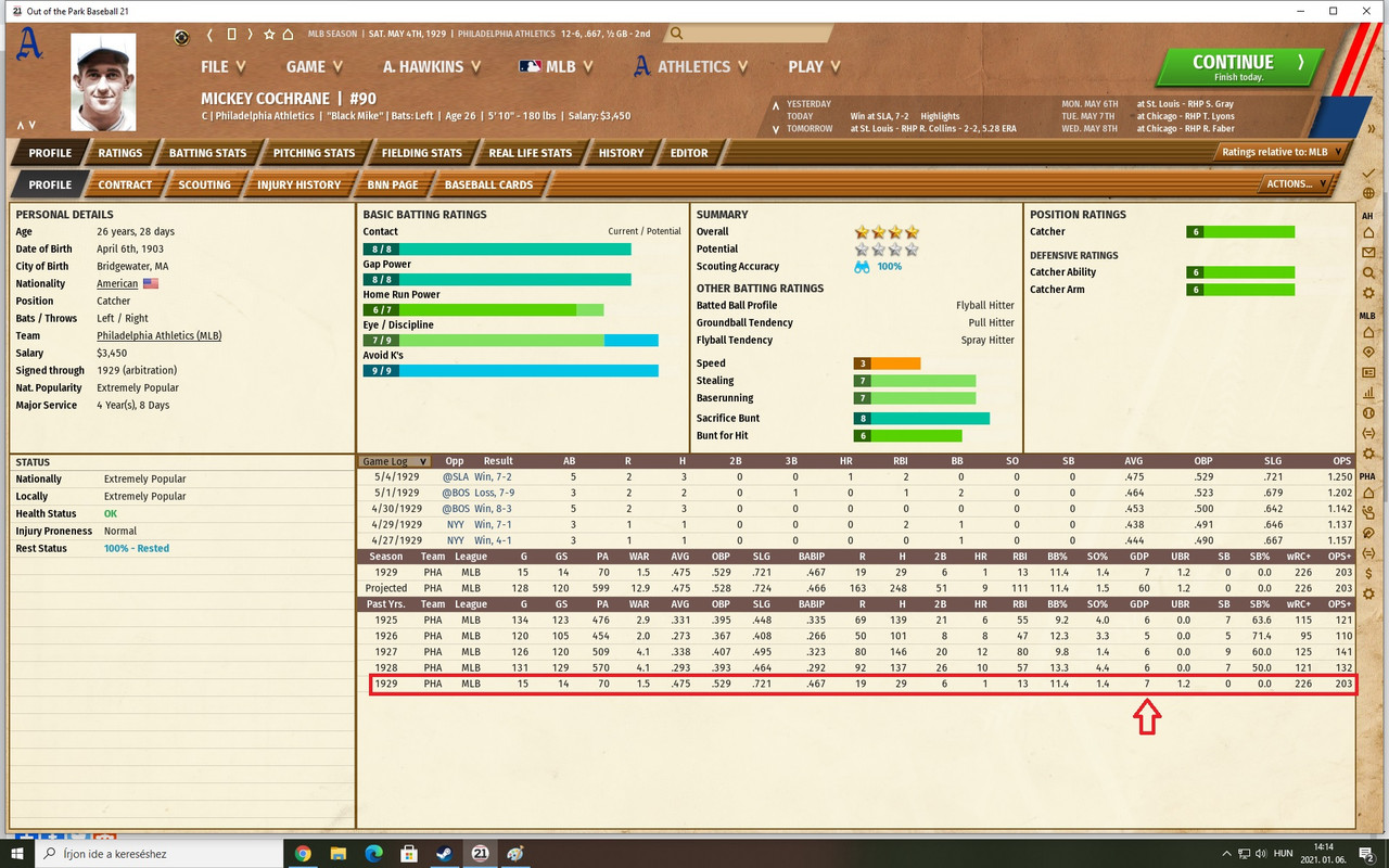 The average AL team in 1929 turned 150 DPs in 154 games. Compare that to 2019, where the average MLB team turned 134 DPs in 162 games. So teams in '29 were actually more adept at turning DPs than teams in 2019. A big part of that was probably due to the fact that there were just so many baserunners, more than in 2019 (both because of the higher batting averages and because so much offense in 2019 is generated by HRs). The leaders in GIDP in 2019 were Jose Abreu and Manny Machado, who both had 24. So it really wouldn't be too surprising if a slow guy like Mickey Cochrane grounded into 20 or more DPs during the season, despite what OOTP shows as his "career stats." |