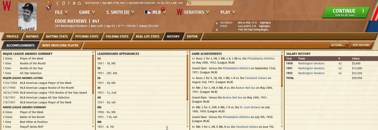 The file "players_at_bat_batting_stats.csv" will detail every single at-bat over the course of the season. First picture attached is what that CSV file looks like in an Excel table, and note the bolded columns. Result corresponds to the at-bat outcome. A value of '9' means the batter hit a home run. base1, base2, and base3 tells whether there is a runner on first, second, or third respectively. 1 means there is, 0 means there is not. If I want to look at career grand slam totals, I stitch all of these yearly files together (I use Python), filter those 4 fields such that all remaining at-bats are grand slams, and do a group by on the Player ID. Picture two shows a result of the group by, and picture three shows the profile of the player with the ID 1682. Pouring through his game achievements I can confirm he hit 20 grand dingdongs during his career. Last edited by BradG223; 02-21-2021 at 08:13 AM. |
