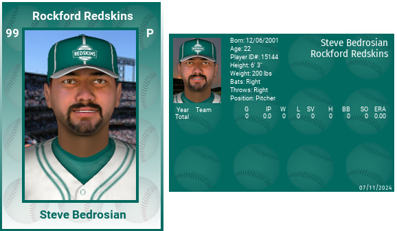 This is a new thread for my league which was under Tate Redinger. I feel invigorated by the league which is in it's sixth season but the thread that I created has been schizophrenic to say the least. It started as a "follow the player" thread, then went to capturing an ever expanding league, to following the team that Tate played for... Bottom line, I got more proficient with the uniforms, screenshots and the like, and the concept of the thread morphed.