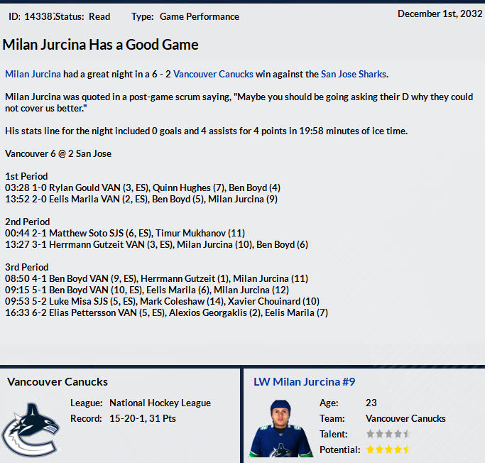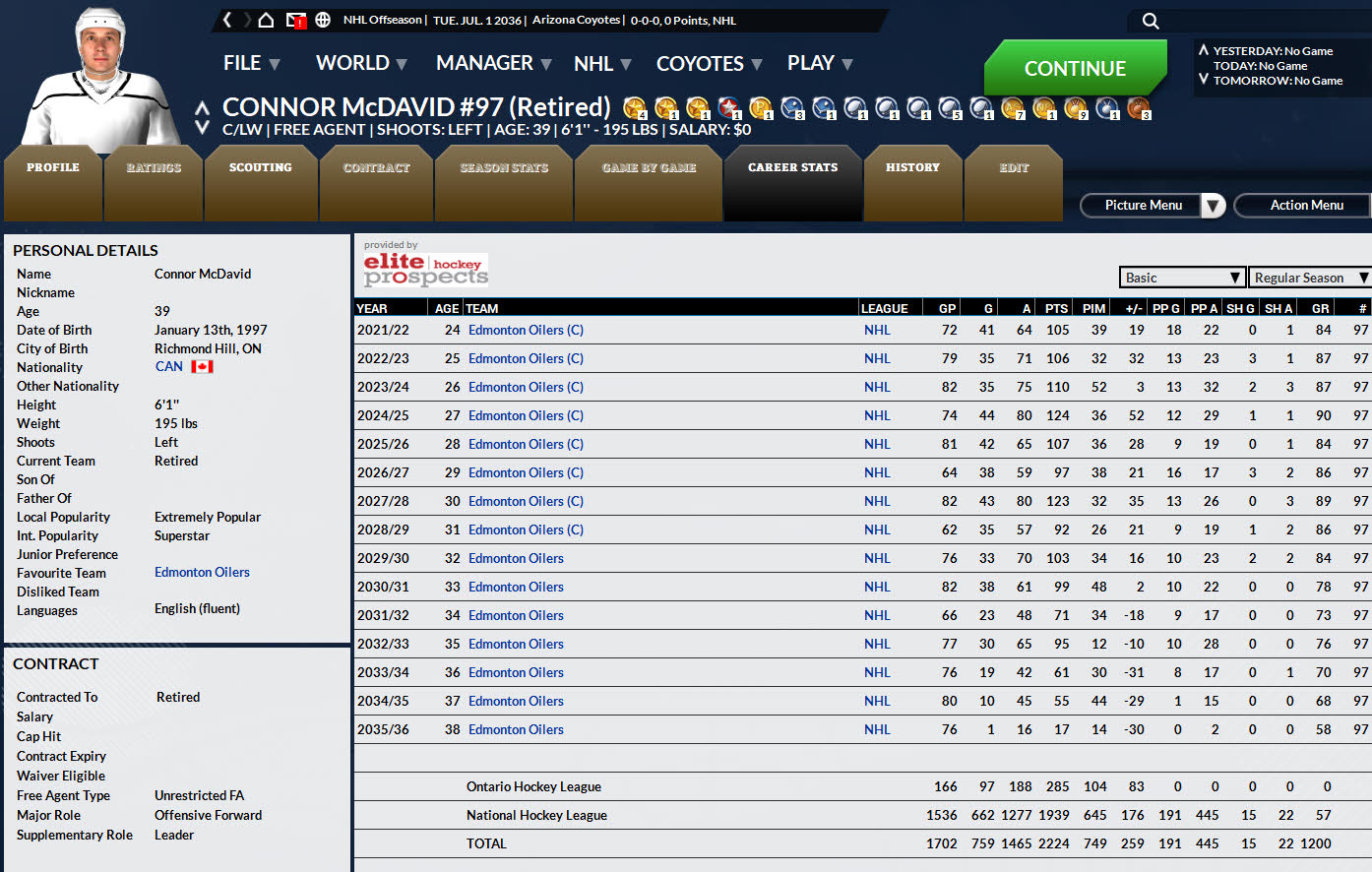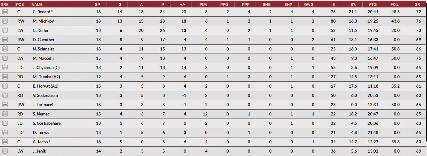 Very interesting season. There are two teams, that destroyed opponents. Vegas and Arizona with 129 points and 63 respective 62 wins. But look to the Coyotes. They finally cracked the 400 GF line. This team also scored 25 SHG! Cole Eiserman with 133 points and +78. But there is another player who deserves attention. Connor Bedard played only 65 games and still won the goal-scoring race with 56 goals. Unfortunately, we lost in the 1th round. Last edited by alko; 11-25-2021 at 01:48 AM. |