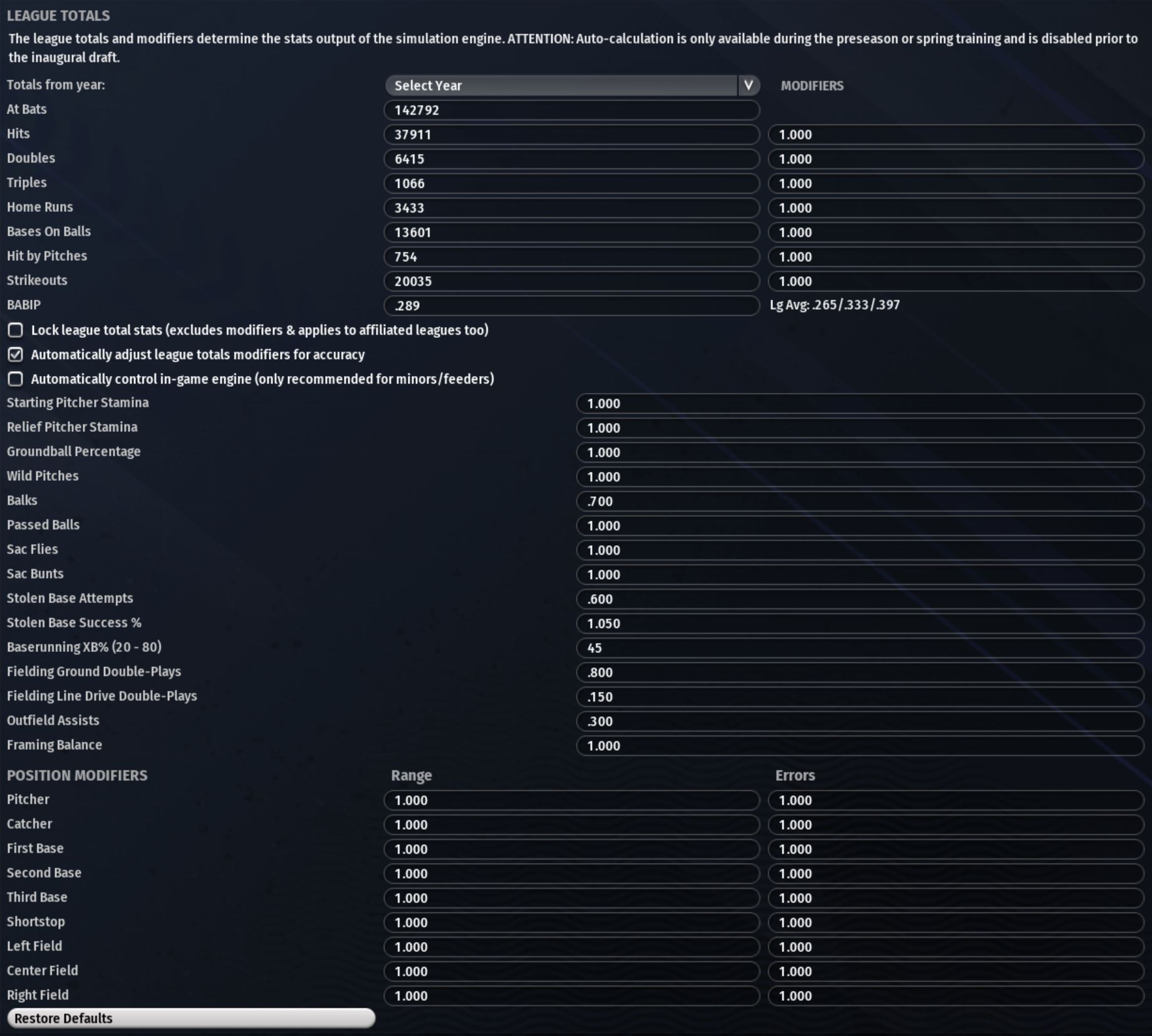 Oof. This one's a doozy. Are you trying to replicate the output of a certain season, or do you want that feature automated? Looks like you've got that box checked, so I'm gonna assume automated. You can also do it manually, by merely selecting the year, and the AI will fill in the modifier settings that it will use to try and reach the league totals that you're hoping to reach.