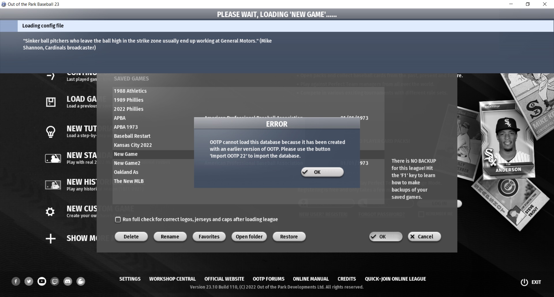 Its no real secret how I feel about this game's AI's ability to manage rosters and transactions, so I decided to abandon playing a historical or modern day game and try my luck at creating my own fictional baseball world. So I went back to 1973 and created the American Professional Baseball Association, with the "lore" being a response to the labor issues that started in 1972. I created fictional players. Teams with logos. Fictional ballparks for each team with accurate long/lat's for their respective cities. I expanded the league four times bringing it up to 28 teams. My plan was to sim to the 30th anniversary of the league, expand one more time, and take over the team of my choice. I even started drafting the "History of the League" document complete with a profile of one of the greatest hitters that I've ever encountered in the game with the intent of starting a Franchise thread here on the board. I made it to 2000 this morning, and logged out to take a break and spend the day with my family. I got home 15 minutes ago, went to log in, and BAM! There it was: "OOTP cannot load this database because it has been created with an earlier version of OOTP. Please use the button "Import OOTP22" to import the database." followed by: "The loading of the database failed. It is either corrupt or a save-game from an old version." In 18 years of playing this game I've never once had this happen. Absolutely positively RIDICULOUS. That's probably around 16 hours of work just down the friggin tubes. I'm so done with this game and this franchise, but being around as long as I have been, I figured I'd jump in here and see if anyone had any suggestions because I'm at my whit's end.