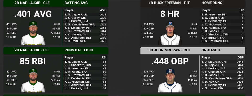 No suprise really but Nap Lajoie is ahead in batting average, tied in home runs (8), leads in RBI and has his Cleveland Timbers in first place in the Western League. Some player!
