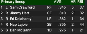 The Cleveland Timbers, after being swept in the World Series in 1901, look like the team to beat in 1902. Their lineup, especially the top 5, is very dangerous and includes three Hall of Famers, Nap Lajoie, Ed Delahanty and Sam Crawford. I am interested to see where Delahanty ends up, not having stepped into the Niagara River as he did in real life in 1903. 5th place hitter Dan McGann also had a strange suicide. From SABR: