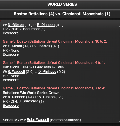 The Boston Battalions are world champions for 1902. They defeat Cincinnati 4 games to 1 with 2 victories behind Rube Waddell, series MVP. Waddell defeated Cincy's Deacon Philippe in both games and allowed just 1 run in each. Jimmy Sheckard did set a WBL record with 5 hits in Game 5 for the Moonshots.