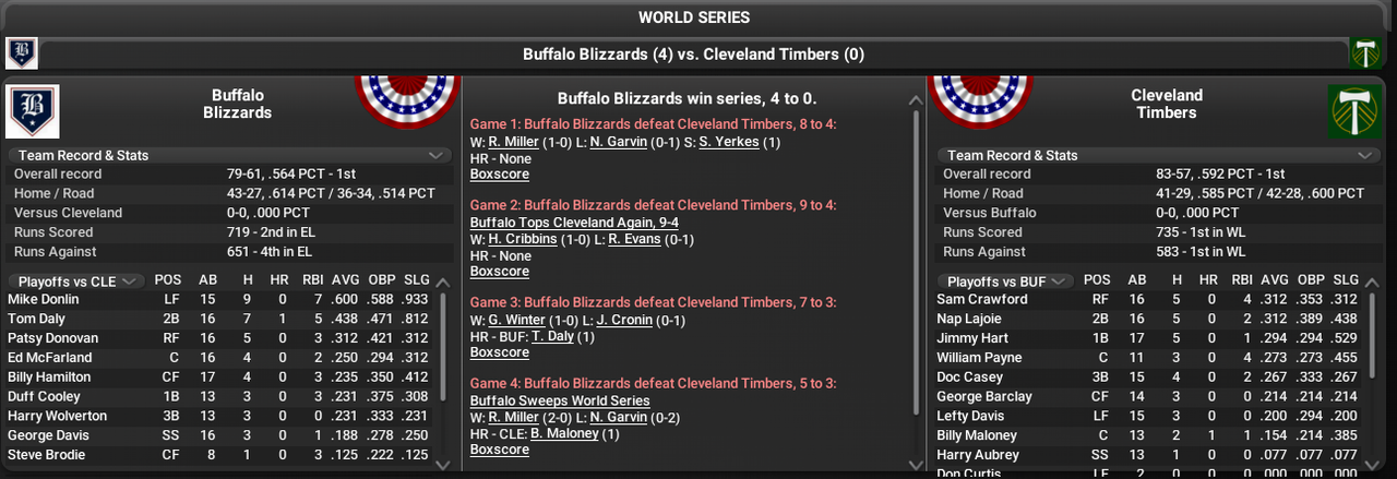 The Buffalo Blizzards defy the odds and win the first WBL World Series, sweeping what looked like a superior Cleveland team led by Nap Lajoie and Sam Crawford. Mike Donlin wins the World Series MVP, he hit .600 in the short series with 7 RBI.
