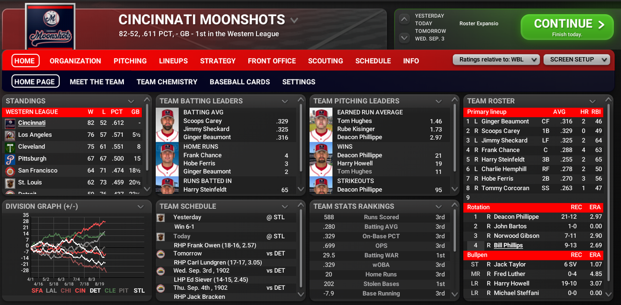 After a strong start by Cleveland in the Western League, the Cincinnati Moonshots have taken over the league, now 82-52 heading into September and up 5 and a half over up and coming LA. Deacon Phillippe leads the Western with a 21-12 mark, 2.97. The team also features Ginger Beaumont, Scoops Carey, Jimmy Sheckard and Frank Chance.