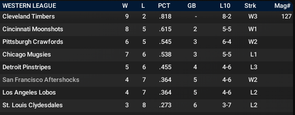 The San Francisco Aftershocks have been led by Christy Matthewson on the mount (1.80 ERA) and Jesse Burkett at the plate. The Outfielder is the only .400 hitter in the WBL.
