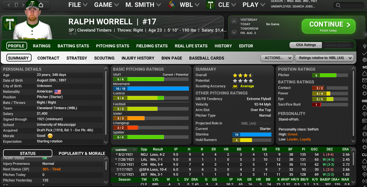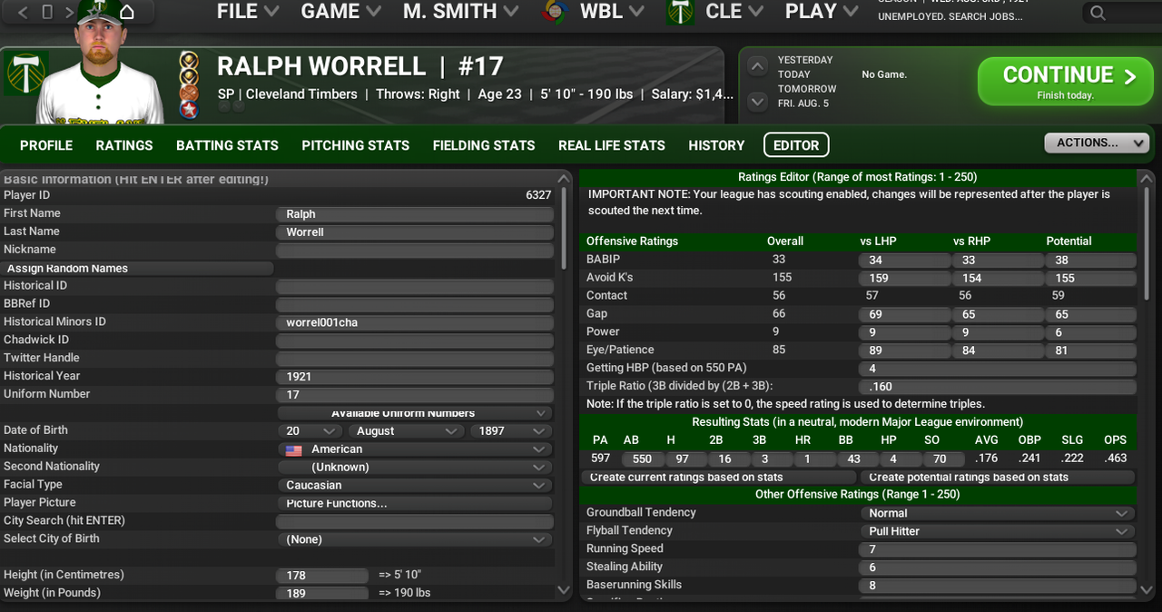 But now in 1921, it seems like a whole lot of guys who never made the majors are in the league - especially pitchers. I am wondering if there is some kind of error in the league set up or if that is normal. Maybe because pitching stats were so poor in those years? Case in point, my Washington franchise is in the first place and literally the entire rotation is made up of guys who did not make the MLB. In 1919 and 1920, a guy named Ralph Worrell won the Cy Young Award both years but he does not have an MLB record. There are certainly plenty of well-known names around the league but seems like a lot of guys who never made it. I am playing 1921, 16 teams, I do not have minors on, color barrier is in place still, 25 man rosters... Thanks in advance! |