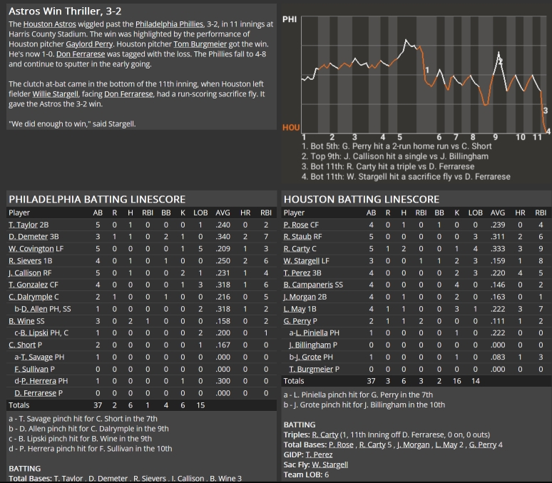 What I am seeing is that sometimes there will be extra-base hits that happen in the game but are not displayed on the box score. Currently I have only seen it in 3 of the 11 games I have simmed. All of these games were played 3D (single pitch, every play) as opposed to just simming the whole game in one pass, or even whole innings at a time. Unfortunately, the box scores are html files so I can't upload them, but the attached screenshot will demonstrate. Look at Jerry Grote in that screenshot. He hit a 3-run homer in the first inning. He has 1 hit for the game and 4 total bases. But the "Home Runs" line is completely missing from the box score. In addition, there were two Cubs who hit home runs and their "Home Runs" line is missing as well. I have two other games where Doubles were hit and the "Doubles" line is missing as well. I want to be clear that these hits ARE properly listed in the game log and are reflected in the player stats. They just seem to be missing from the box scores. I generally analyze box scores and this is the first time I've ever seen this bug. That makes me think this is a recently introduced bug. However, I can't say that it's unrelated to manually playing out the games in 3D, so it might be a pre-existing problem if it's somehow triggered by that. I will spend some time tonight looking at the box scores for the auto-simmed games for other teams to see if those games might have this problem as well. Anyway, this is a minor bug but maybe its weirdness might trigger a light bulb in the devs' heads about something that might be causing it. edit: it happened again (4 out of 12 games now) and I've uploaded a 2nd image to demonstrate. You can see in the WPA graph that Gaylord Perry hit a 2-run homer in the 5th (who needs the DH) but there is no listing for "Home Runs" in the box score even though it shows Rico Carty's triple. Also Carty hit a double in that game (2 hits, 5 total bases) and the "Doubles" line is missing as well both BOTH teams (they had 1 double, the Astros had 2). Bizarre. Last edited by uruguru; 07-20-2024 at 09:45 PM. |