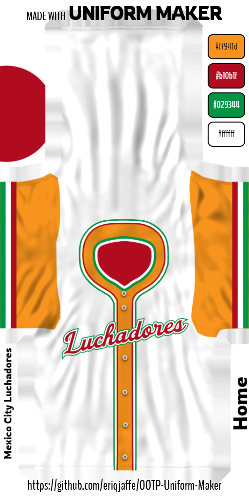 I tried making my own but they came out terribly so I wanted to ask the experts on here. Basically Im looking for a team logo, jersey, and ballcap for the Mexico City Luchadores which are a fictional team. The original logo i created looked like The Crow with hard to read words (especially with the smaller team logos on standings, etc.). I've attached an inspirational logo for something completely different but hoping someone is able to help create something similar for my fictional guys. Thanks in advance. |