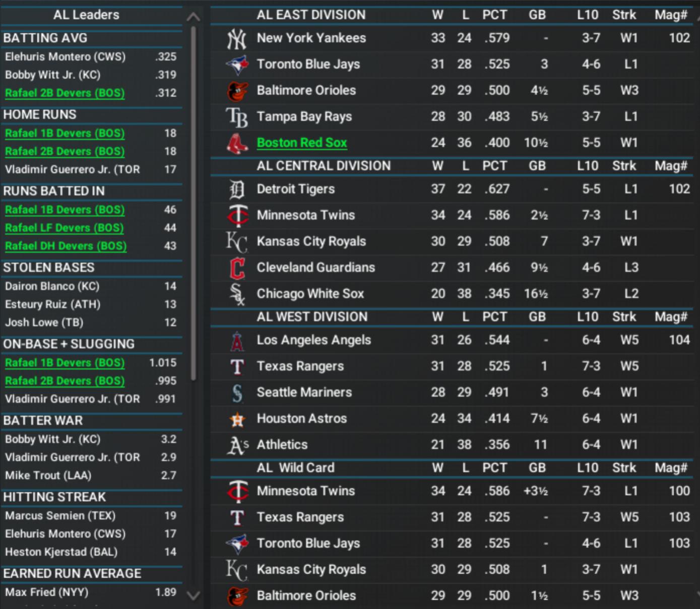 The Sox continued to slide further into the basement, and now have a record of 42-68.  However, Rafael 1B Devers remains an MVP candidate and leads the AL in home runs (39), RBI (81) and WAR (4.7).  Rafael 2B and Rafael RF Devers both demanded to bat cleanup.  Several Deverses were sought after in trades prior to the deadline--I didn't trade them, but did send Aroldis Chapman back to the Yankees.  Rafael C Devers demanded a trade himself- denied.
