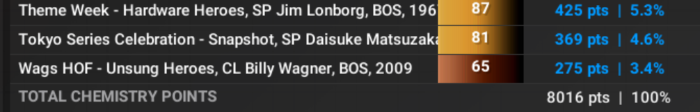 Nevertheless, why it shows 325 on reserve seems odd. Which is why I raised the question. Not a big deal though. I am running a Red Sox Theme team for PT26 so I do pay attention to the chemistry. |