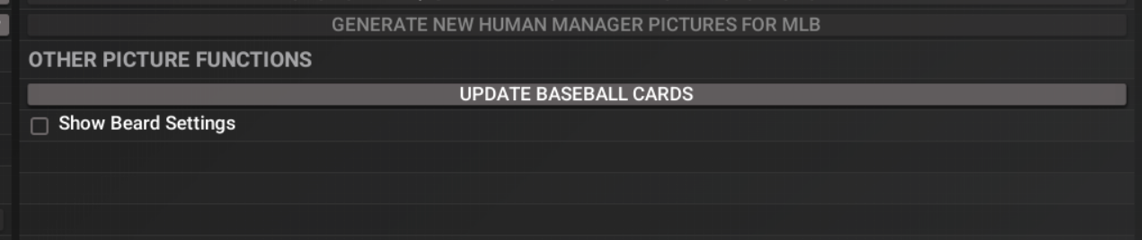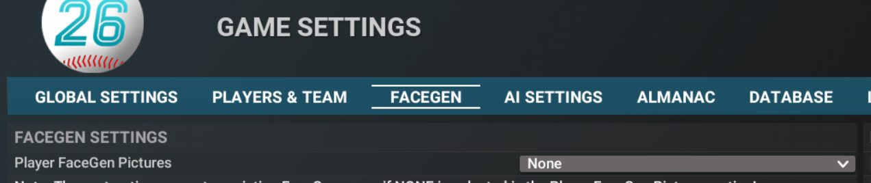 As a test - without changing any of the settings beneath it (so it still pulls photos per your current settings), try replacing the "None" to something else. That change might get player faces in the 3D parks that are not the generic uniform guy. Also, go to the beard settings on the same page, show them, and turn them all to zero. I think there is a combination of settings there that will address 3D settings without impacting the photos and won't generate facegens on the player pages. Sorry, I don't use photos so don't have the precise settings to achieve it.